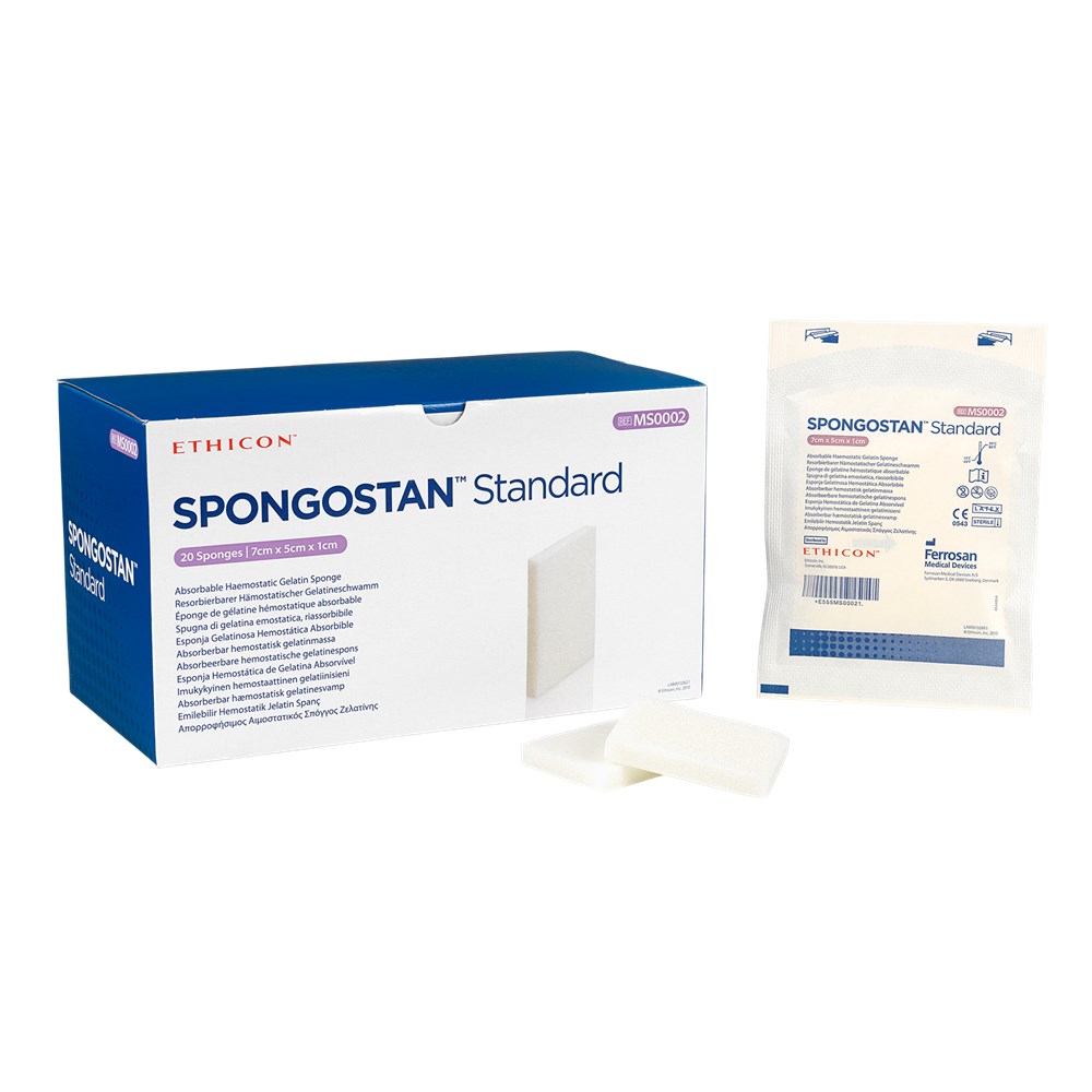 SPONGOSTAN Standard is a versatile absorbable gelatin sponge used to control bleeding during surgical procedures. It conforms easily to tissue surfaces and promotes rapid clot formation. Fully absorbable and sterile, it is suitable for a wide range of surgical applications.