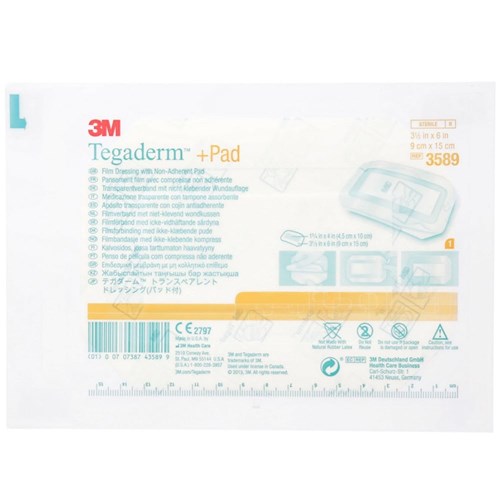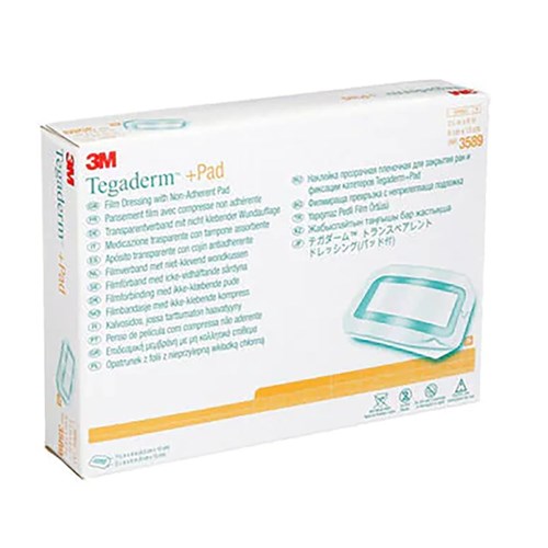 The 3M Tegaderm dressing with pad offers a waterproof, sterile barrier and an absorbent pad for wound protection. Its transparent film allows easy monitoring without dressing removal, reducing disruption to the healing process.
