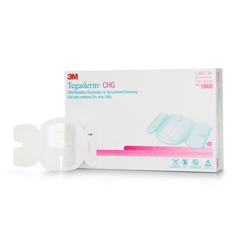 The 3M Tegaderm CHG dressing combines transparent film with a chlorhexidine gluconate gel pad for antimicrobial protection at the catheter site. It helps reduce the risk of catheter-related bloodstream infections while allowing site visibility.