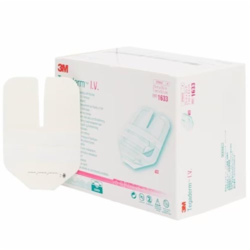 The 3M Tegaderm IV dressing provides a transparent, waterproof barrier for catheter site protection. Its breathable film allows moisture vapor exchange while maintaining a sterile environment for infection prevention.