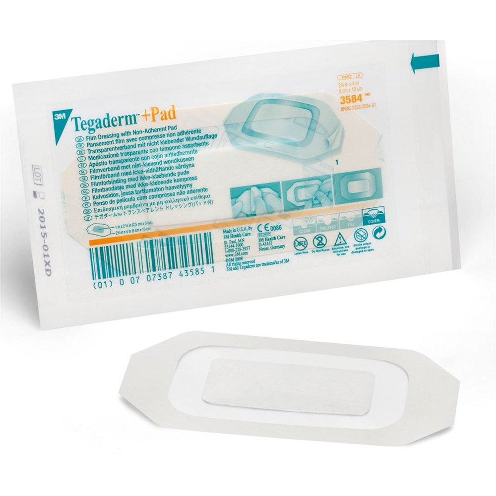The 3M Tegaderm Plus dressing combines a transparent film barrier with an absorbent pad for wound protection. It provides waterproof coverage while allowing moisture vapor exchange for optimal healing.
