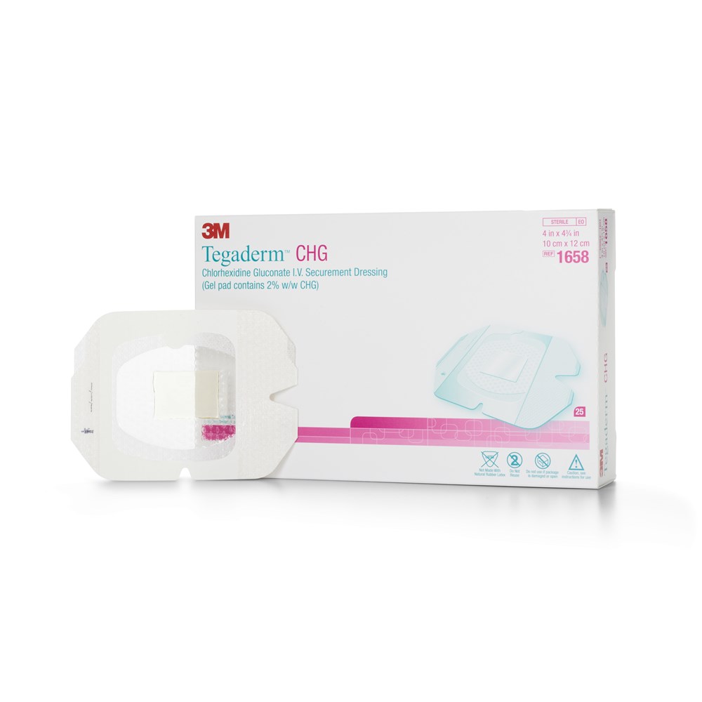 The 3M Tegaderm CHG dressing combines transparent film with a chlorhexidine gluconate gel pad for antimicrobial protection. It helps reduce the risk of catheter-related infections while allowing site visibility.