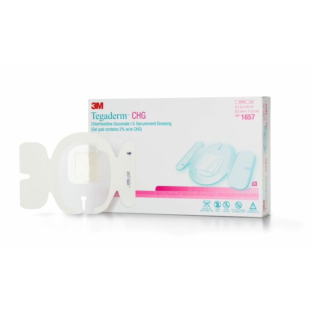 This 3M Tegaderm CHG dressing provides antimicrobial protection and securement for IV sites. Its transparent film and CHG gel pad help reduce infection risk while allowing continuous site monitoring.
