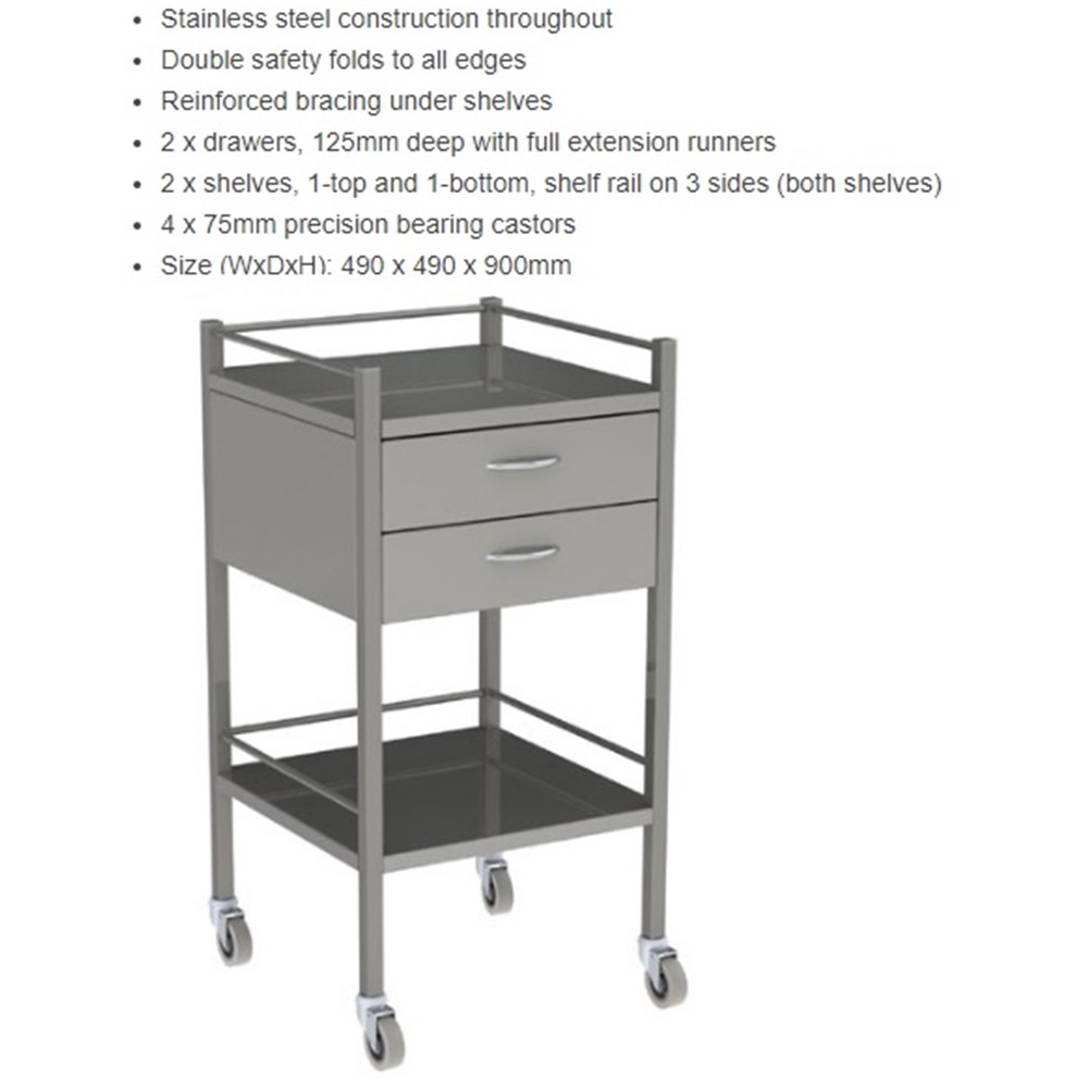 Instrument Trolley - 2 Drawer - With Rail - 490 x 490 x 900mm - Stainless Steel - Single