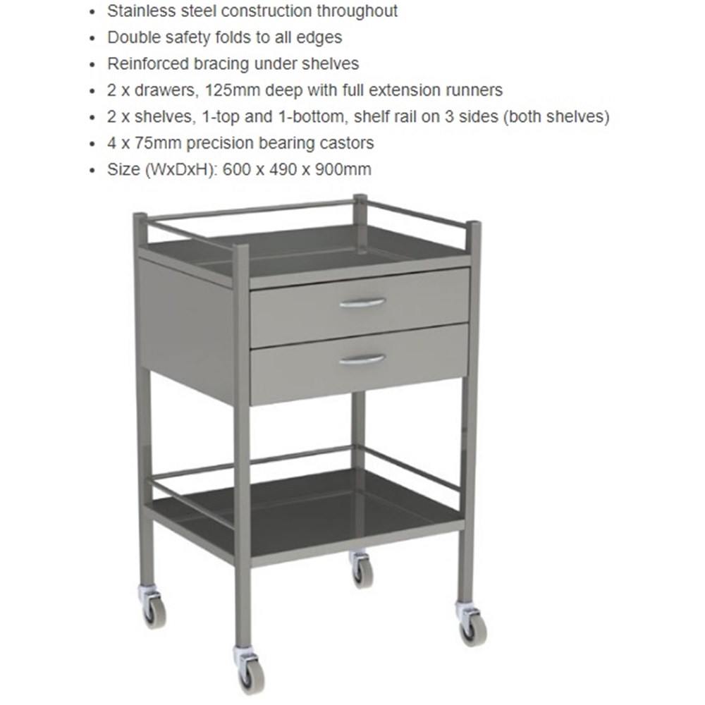 Instrument Trolley - 600x490x900mm - 2-Drawer & Rail - Single