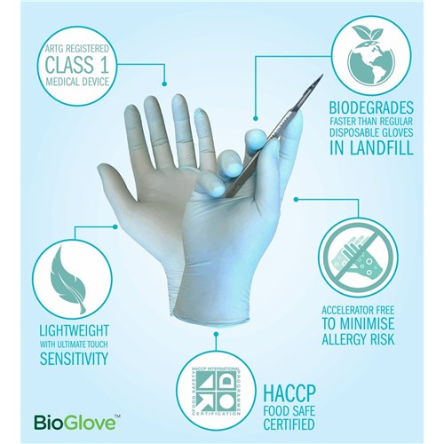 These medium-sized BioGlove nitrile gloves provide excellent tactile sensitivity and grip. Designed for single-use, they are suitable for healthcare, food handling, and general hygiene tasks.