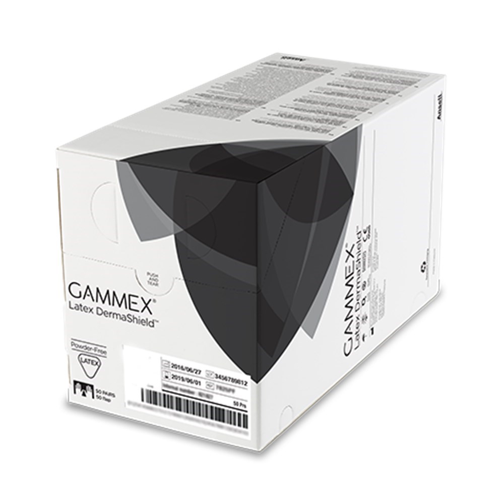 Designed for general surgical procedures, the Gammex Latex DermaShield gloves combine comfort, grip, and ease of donning. Their proprietary internal coating allows for effortless dry or damp hand donning, while the anatomic design reduces hand fatigue during long procedures. The micro-textured surface ensures secure instrument handling, and the gloves are processed to minimise latex protein and chemical residues.