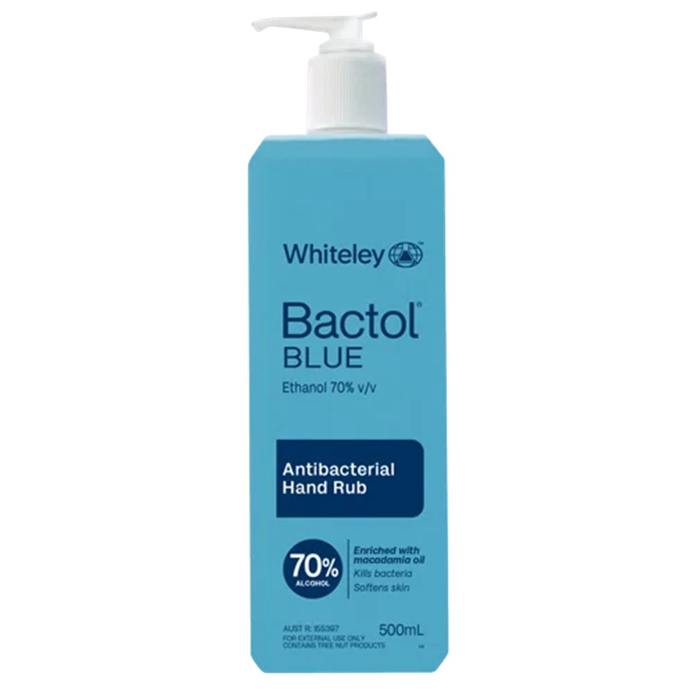 Bactol Blue is an antibacterial hand rub formulated with 70% ethanol for effective germ control. Its pH-balanced formula and natural emollients help maintain skin integrity during frequent use.