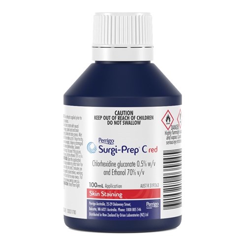 This 100ml bottle of Surgi-Prep C Red provides effective skin antisepsis with a red-tinted solution containing 0.5% chlorhexidine and 70% ethanol. Ideal for pre-procedural skin preparation.