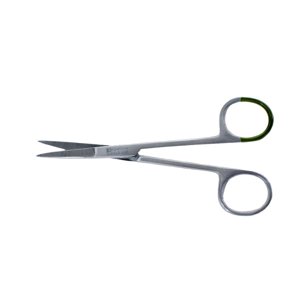 Single-use stainless steel dressing scissors designed for safe and efficient cutting of dressings and bandages. Manufactured from high-grade stainless steel with a green-dipped handle for easy identification as disposable.