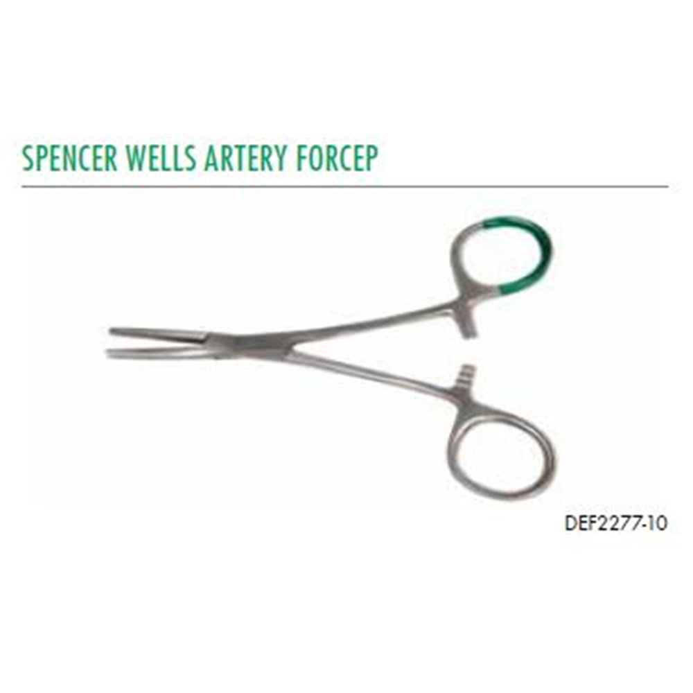 Single-use Spencer Wells artery forceps designed for clamping blood vessels during surgical procedures. Manufactured from medical-grade stainless steel with a green-dipped handle for easy identification as disposable.