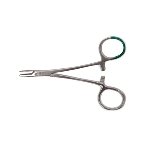 Single-use needle holder designed for suturing during surgical procedures. Features a green-dipped handle for easy identification and a secure grip for precise needle control. Made from medical-grade stainless steel.
