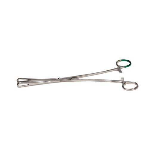Single-use Rampley forceps designed for holding swabs and sponges during surgical procedures. Manufactured from stainless steel with a green-dipped handle for easy identification as disposable.