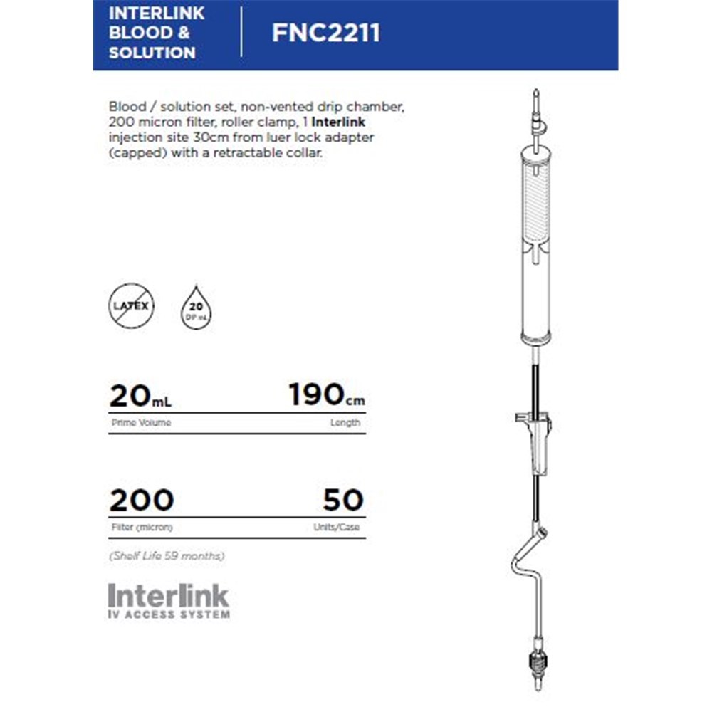 The Baxter Interlink Blood/Solution Set (FNC2211) is a straight-type IV administration set designed for safe and efficient blood transfusion and fluid delivery. It features a standard blood filter and Interlink injection site for needle-free access.