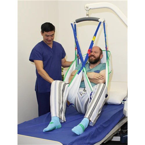 The medium-sized disposable sling provides safe and hygienic patient handling in clinical environments. Its clip-style design ensures secure attachment to lifting equipment, while single-use construction reduces infection risks.