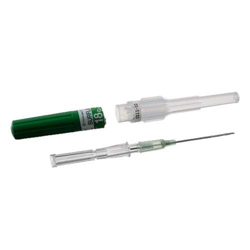 Surflash IV catheters are designed for efficient venous access with visual confirmation via an integrated flashback chamber. The 18G size supports moderate flow rates for general clinical use.