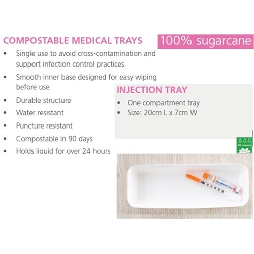This compostable injection tray offers a sustainable alternative for organizing syringes and needles during clinical procedures. Designed for strength and durability, it supports infection control while reducing environmental impact.