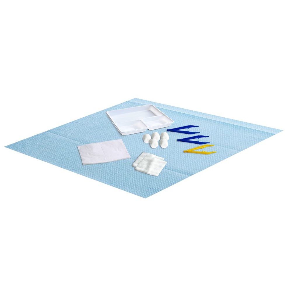 Each pack Contains: 1 x PE/Cellulose Sterile Field, Blue, 50cm x 50cm (Wrapper), 1 x White Dressing Tray (Plain 3 compartment), 1 x Dressing Towel, 40cm x 40cm, 5 x Cotton Balls, 2 x Gauze Swabs, 7.5cm x 7.5cm, 8 ply, 3 x Disposable Plastic Forceps: 2 x Blue, 1 x Yellow, 11cm