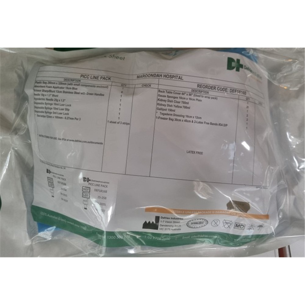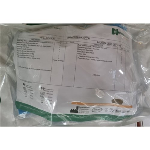 Comprehensive sterile procedure pack designed for PICC line insertion. Contains all essential consumables required for safe and efficient placement, wrapped in a sterile field for immediate use. Reduces setup time and ensures procedural consistency.
