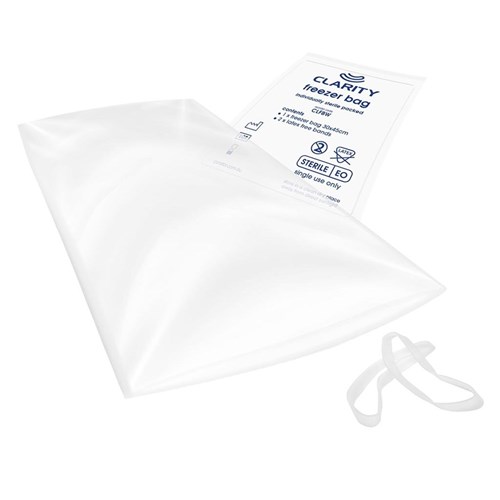 Pack Contents: 100 sterile freezer bags with rubber bands