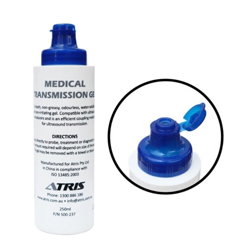 Atris Ultrasound Transmission Clear Gel (Flip lid with valve) Apply directly to probe, treatment or diagnostic area. The amount required will depend on size of the area.